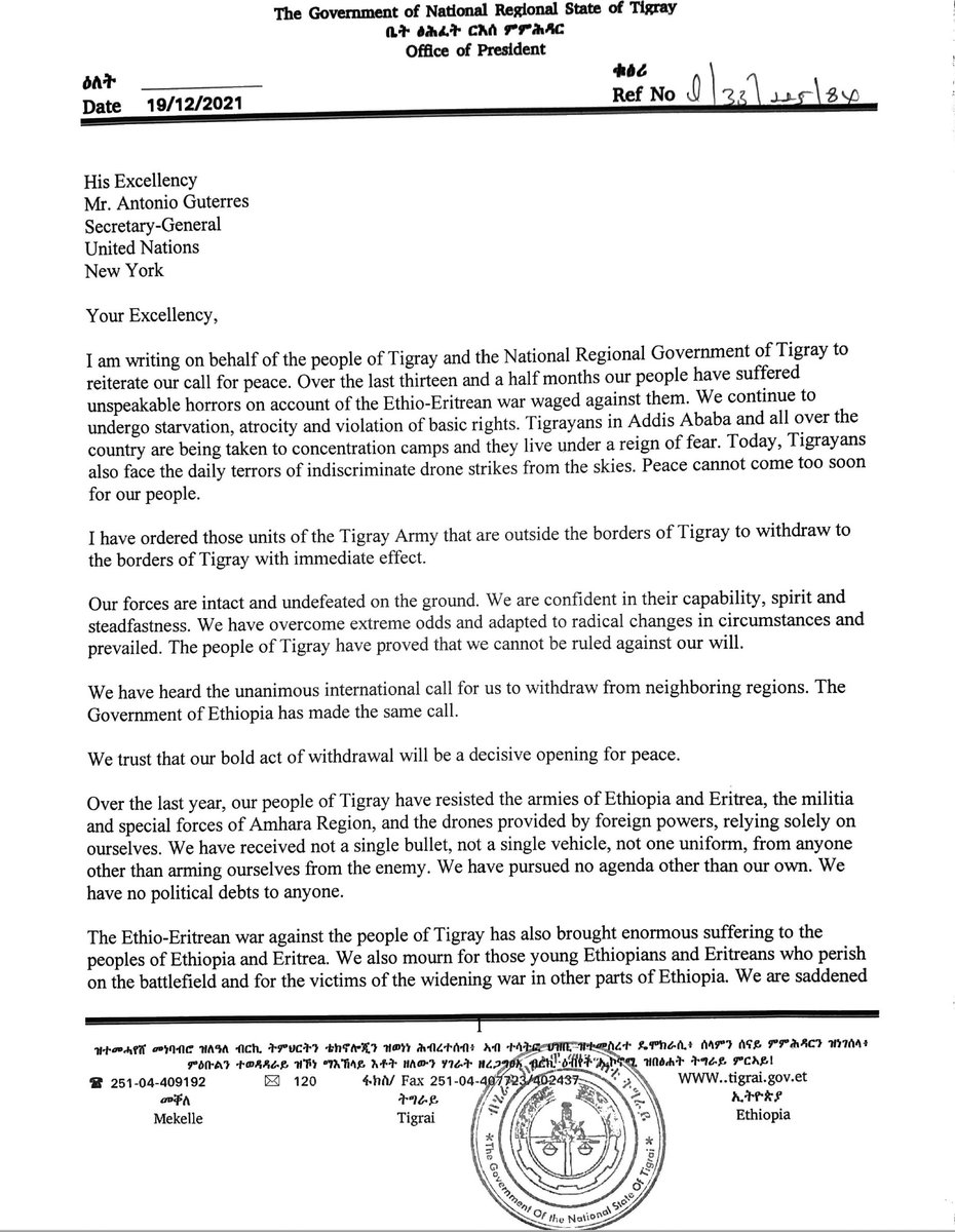 Руководитель НФОТ отправил письмо в ООН, где заявил, что отдал приказ начать отступление всех войск Тыграя с территории Эфиопии к границам Тыграя. Фактически, это является признанием того, что несмотря на первоначальные громкие победы с захватом огромных территорий и не менее огромного количества пленных, операция с целью захвата Аддис-Абебы провалилась и закончить войну в свою пользу военными средствами НФОТ не может. Потерпев поражение в боях к югу от Дессие и сдав город и прилегающие территории, армия Тыграя начала отступать на север, а контролирующие значительные районы страны мятежники оромо очень слабо координировали свои действия с НФОТ, в результате чего концентрированного наступления на столицу с нескольких направлений не получилось. Достаточно странное поведение, так как отбив наступление Тыграя, правительство получает возможность в среднесрочной перспективе сосредоточить часть сил для подавления мятежа (как минимум в критически значимых районах страны).