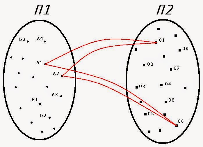 На рисунке, в качестве примера показано, что элементы А1 и А2 множества П1 (расшифровку о том, что это за цели жизни см. выше) относятся к элементам О1 и О8 множества П2 (расшифровку также см. выше). И таким образом, по сути можно представить систему отношений П1 к П2 по всем элементам каждого из множеств.