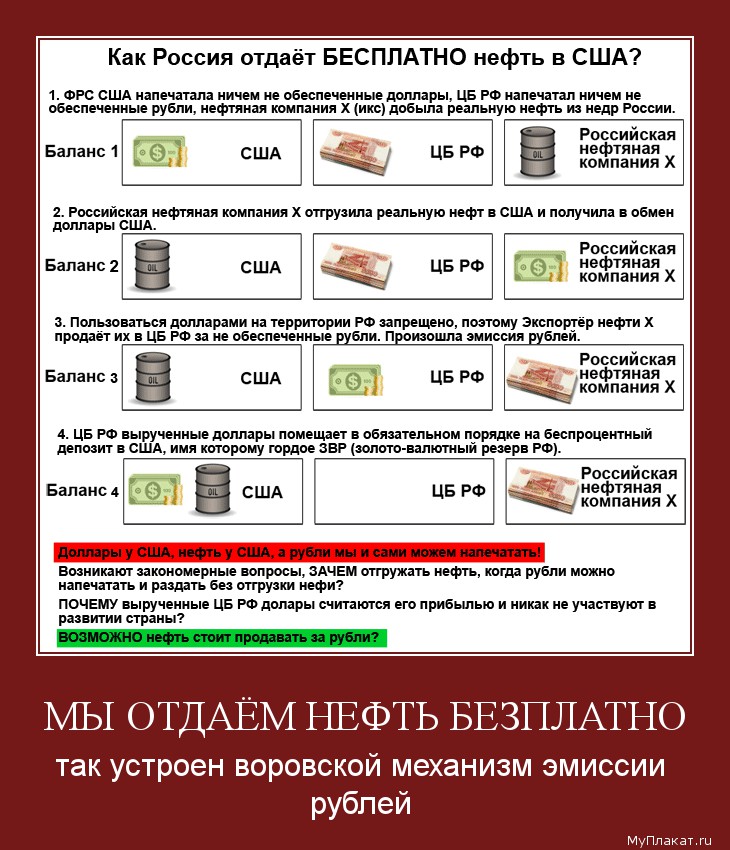 Безналичные доллары, при продаже нефти всё так же остаются в США, а вовсе не "едут" в нефтяную компанию. Они эмитируются ФРС и меняют собственника, но остаются на счёте нефтяной компании в американском (или транснациональном) банке. Хотя на схеме доллары как бы находятся у нефтяной компании. Далее после всех манипуляций эти доллары всё так же остаются на счёте американского банка, подчинённого ФРС, но владелец счёта - ЦБ РФ, эмитировавший рубли для нефтяной компании и получивший в ЗВР "её" доллары.