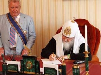 На одной из представленных фотографий запечатлен патриарх, сидящий в кабинете за дорогим массивным столом, рядом с ним глава фонда «Софрино» Евгений Пархаев, отмечавший в то время юбилей, пишет URA.ru.