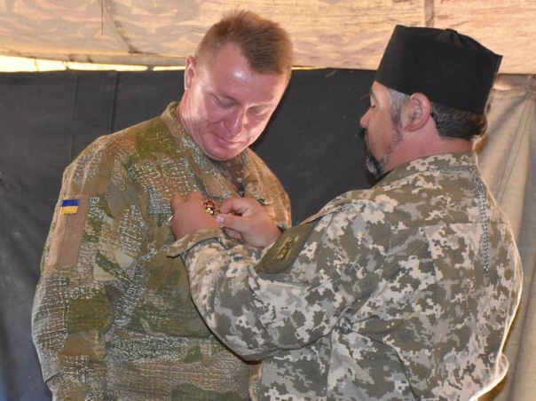 Также за проведение карательных операций его наградили священники, которые занимаются 14 отдельной механизированной бригадой, отцы Юрий, Игорь и Михаил, вручили командиру 14 ОМБр полковнику Александру Жакуну высшую церковную награду Волынской епархии Украинской православной церкви Киевского патриархата «За жертвенность».