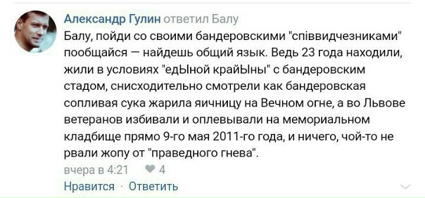 Уже три дня у меня перепалка с одной питерской кастрюлеголовой мразью. Все комментарии я не стала скринить, кому захочется я дам ссыль на эти диалоги. Суть в том, что это существо считает поголовно всех территориальных украинцев, в том числе и новороссов- скучущими суками, исключение у него только для крымчан ( https://vk.com/wall-85512455_768667)Собственно это видно по скринам. Я сначала пыталась донести у*****, что везде есть исключения, что нельзя судить обо всех -по кучке уродов скачущих на митингах, хотя бы потому, что он лично не вправе это делать. Не в праве потому, что находясь в правовом государстве тяжело судить о том, как бы ты поступил при захвате власти в твоей стране. Я уж думала свернуть разговор с неадекватом, но передумала. Я знаю, что большинство в группе не разделяет его мнение, ну по крайней мере я на это надеюсь, мне просто хочется узнать какой процент всё таки с ним солидарен. Какое количество русских превратились в таких же фашистов как он. Ведь у этого упыря мнение такое, что нормальные только те, у кого паспорт с орлами, остальные- нелюди.