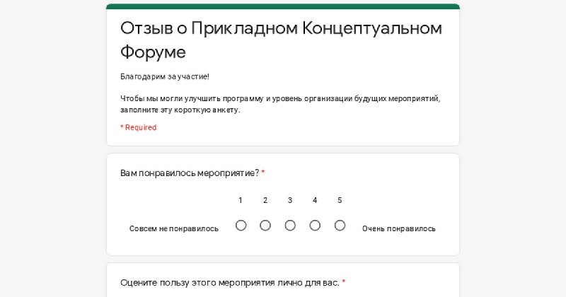 Google Docs</br>Отзыв о Прикладном Концептуальном Форуме</br>Благодарим за участие! Чтобы мы могли улучшить программу и уровень организации будущих мероприятий, заполните эту короткую анкету.</br>