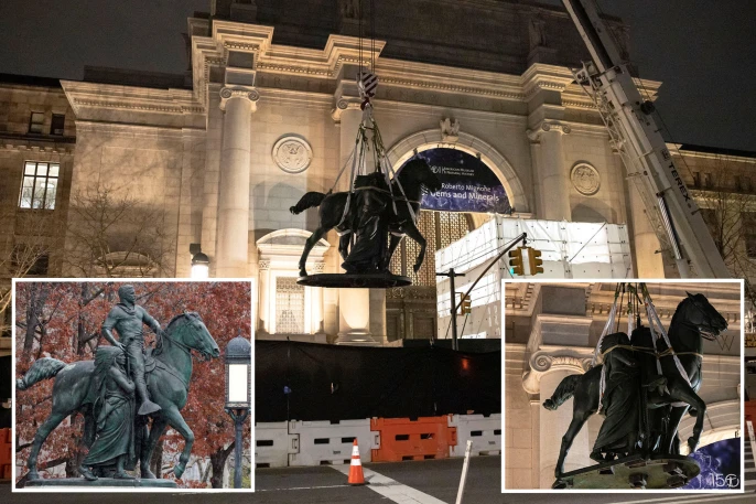 Статуя изображала Тедди Рузвельта на коне, рядом с которым шли индеец и негр. Простояла она более 80 лет.