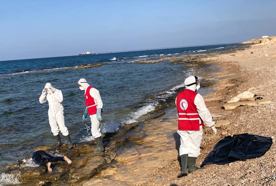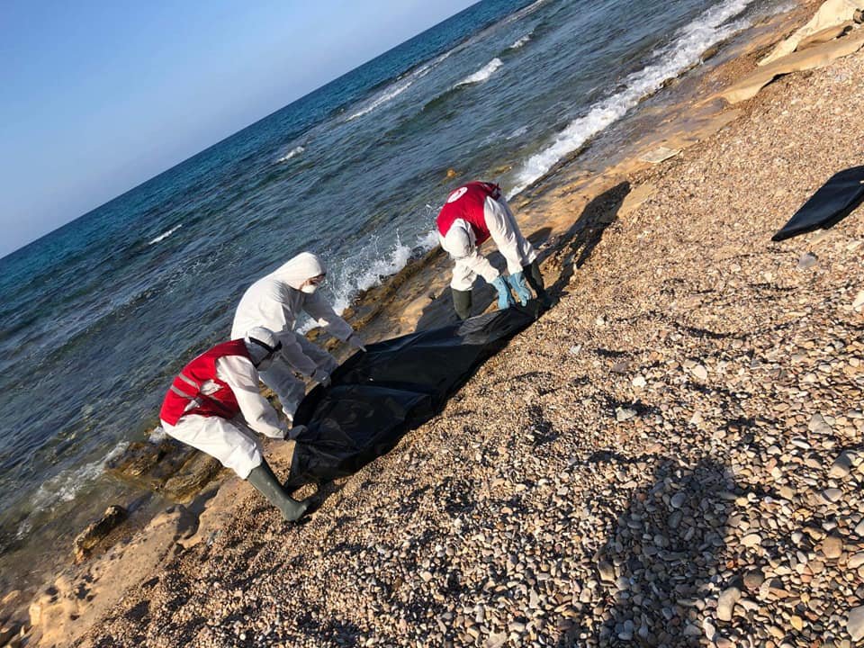 Сотрудники Красного полумесяца собирают по пляжам к востоку от Триполи покойников.