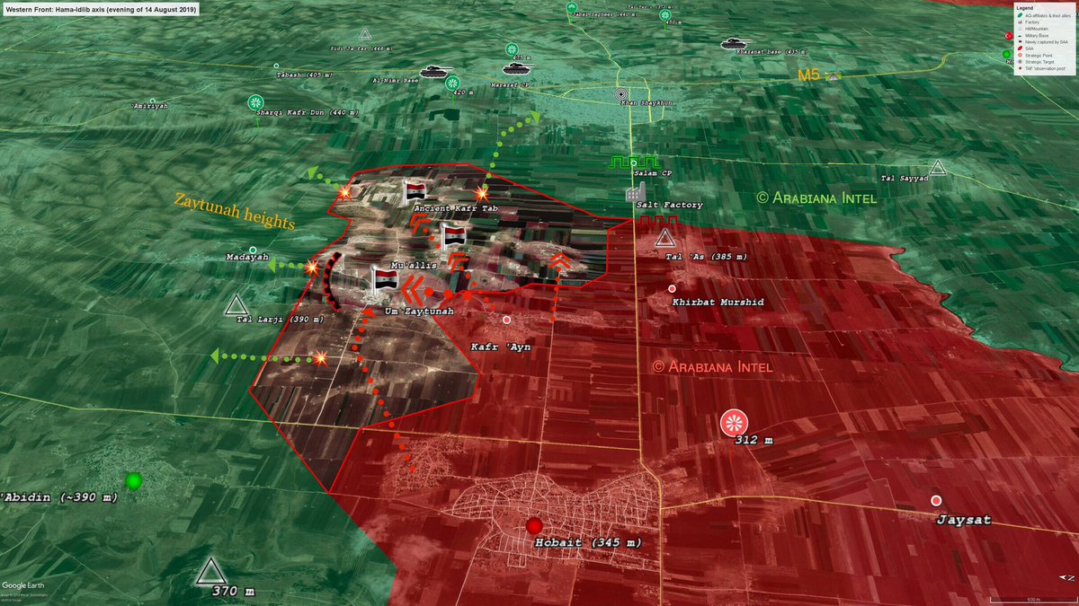 2. В восточной части Эль-Латминского выступа продолжились тяжелые бои в районе Сукайка и высоты Аль-Тери. Вчера в ходе боевых действий сирийцы потеряли Су-22 сбитый огнем с земли. Противник применяет смертников, артиллерию и РСЗО. Активность противника обусловлена тем, что в восточной части Эль-Латаминского выступа работа авиации не была столь интенсивной, как на западе, поэтому отряды боевиков тут еще не столь потрепаны и сохраняют некоторое кол-во тяжелого вооружения, которое они пытаются использовать в локальных контратаках, чтобы сбить темп продвижения САА к Тамане, Аль-Тери и Хазанату.