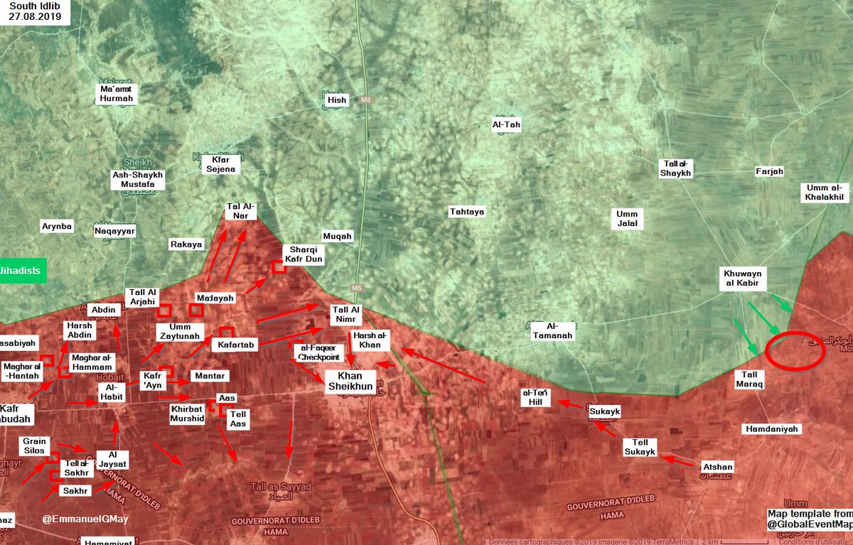 Стянув силы в юго-восточный Идлиб боевики вчера поперли на позиции САА, что вылилось в весьма кровопролитные бои с потерями с обеих сторон (называются цифры до 50 убитых), включая бронетехнику. Боевики пытаются своей активностью ослабить давление на Кафр-Сажну и Таману, снизить угрозу Маарат-ан-Нуману и вынудить САА перебрасывать резервы на угрожающий участок, дабы сорвать наступление САА вглубь Идлиба. Пока же активность боевиков вылилась в активизацию авиаударов ВКС РФ и ВВС Сирии на наступающей группировке боевиков.
