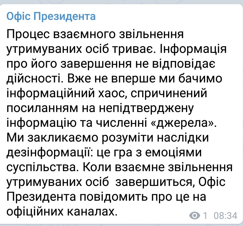 3. СБУ также подтверждает факт переговоров, но указывает на их незавершенность. Украинский самолет, который должен был забрать подлежащих обмену лиц из Москвы еще не вылетал.
