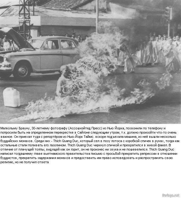 Однако, принимая во внимание обстоятельство, что это - не обычный человек, а буддист-монах (о буддистском мировоззрении, об отношении к жизни, о философии и психотехниках буддистов см. "Сравнительное Богословие", т. 6), эту акцию можно сравнить с гибелью хорошо выдрессированной и обвязанной взрывчаткой собаки под гусеницами вражеского танка. Тоже самообладание, безстрашие, полный контроль эмоций. Я даже предполагаю, что он даже испытал в этот момент наивысшее блаженство, "попав в Нирвану"! То есть, страха перед смертью и страданиями он совершенно не испытывал, введя себя в состояние транса. Это - "самопожертвование" биоробота. Можно ещё сравнить это с гибелью торпеды или бомбы при попадании в цель. Можно ли их за это уважать?