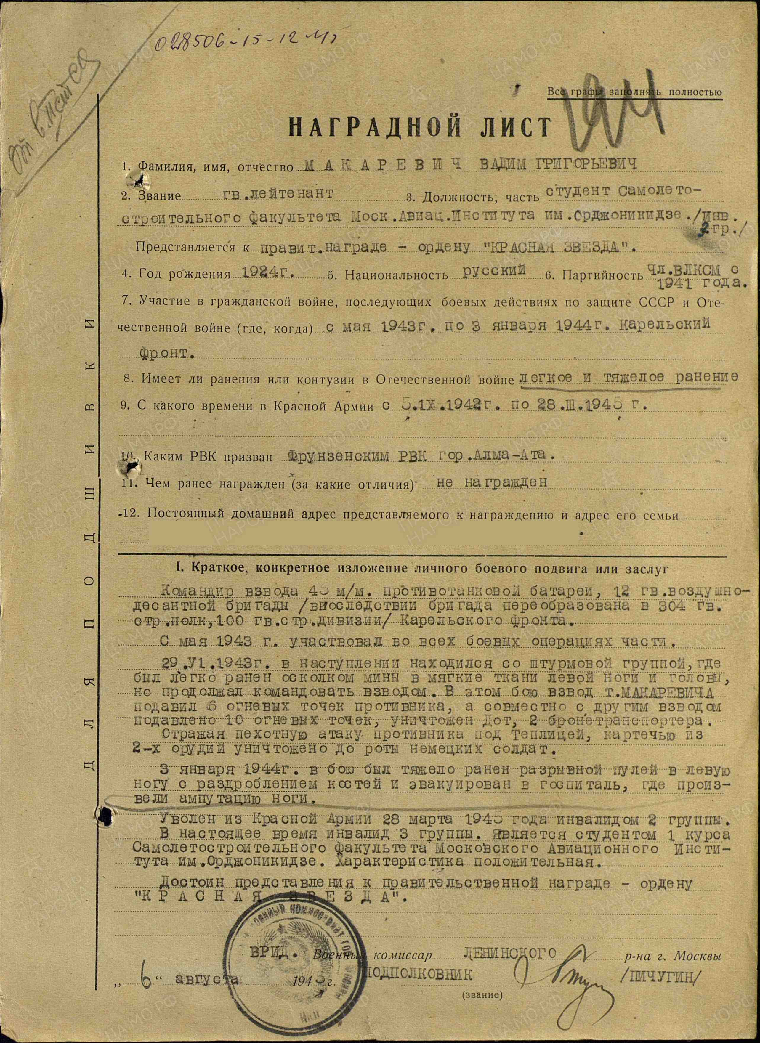Как видим ни один из данных временных периодов не совпадает с периодом нахождения Макаревича В.Г. на фронте, указанном в наградном листе.