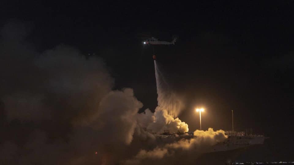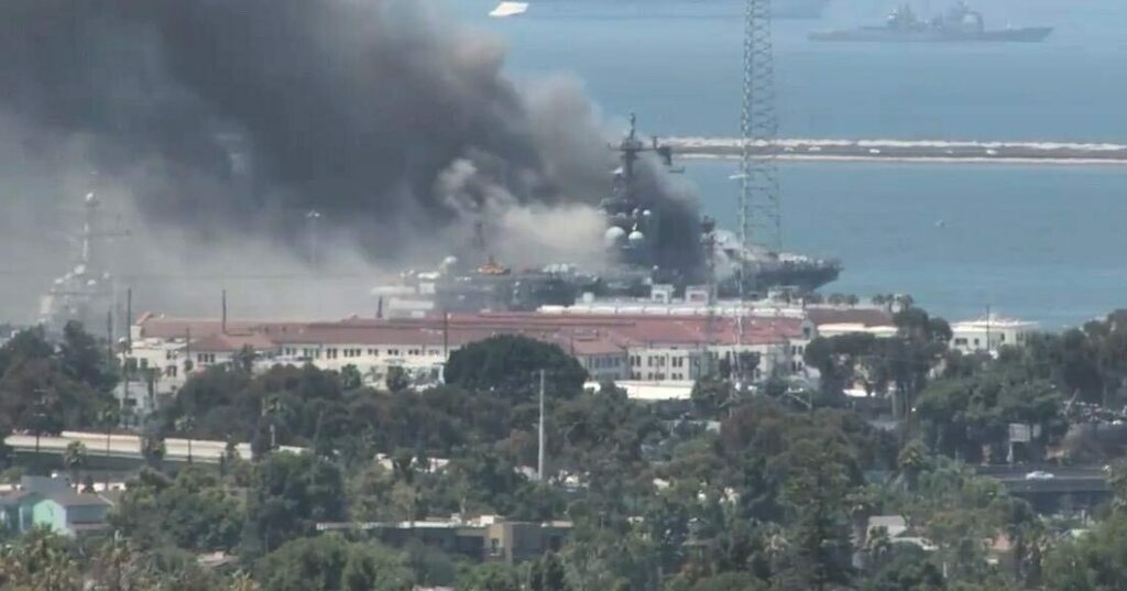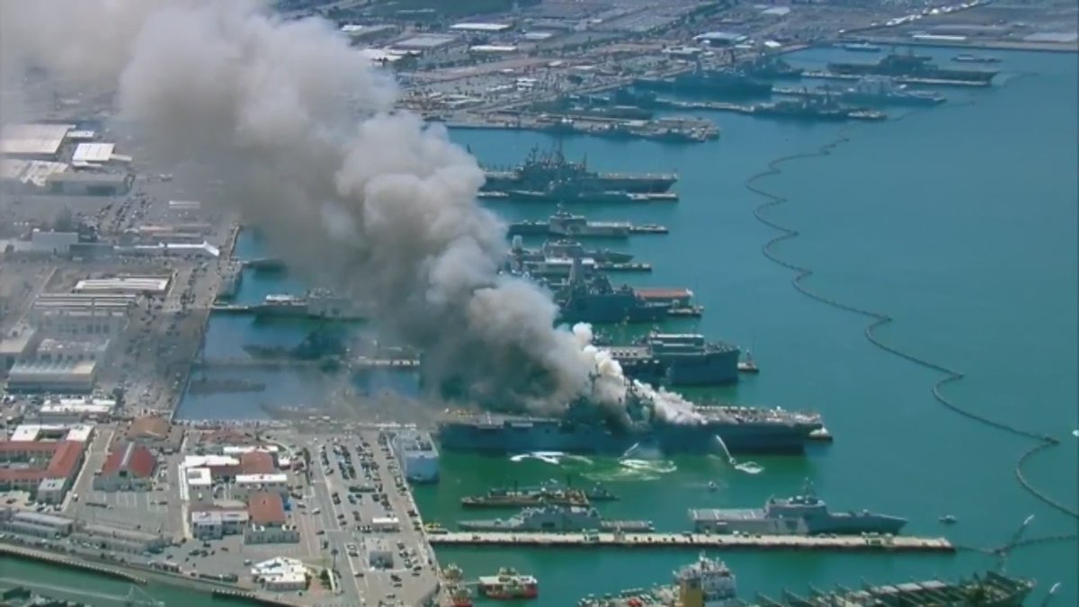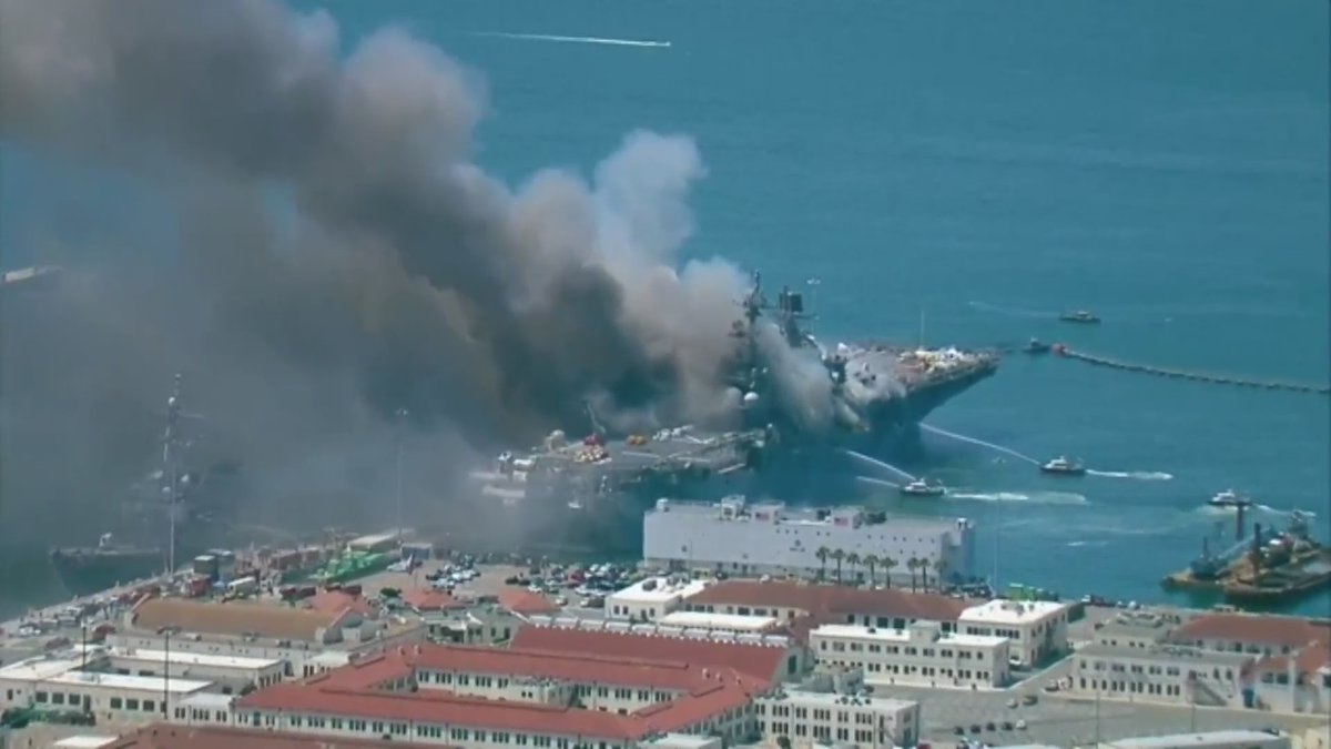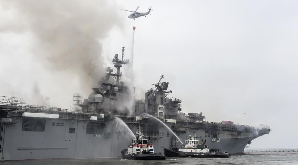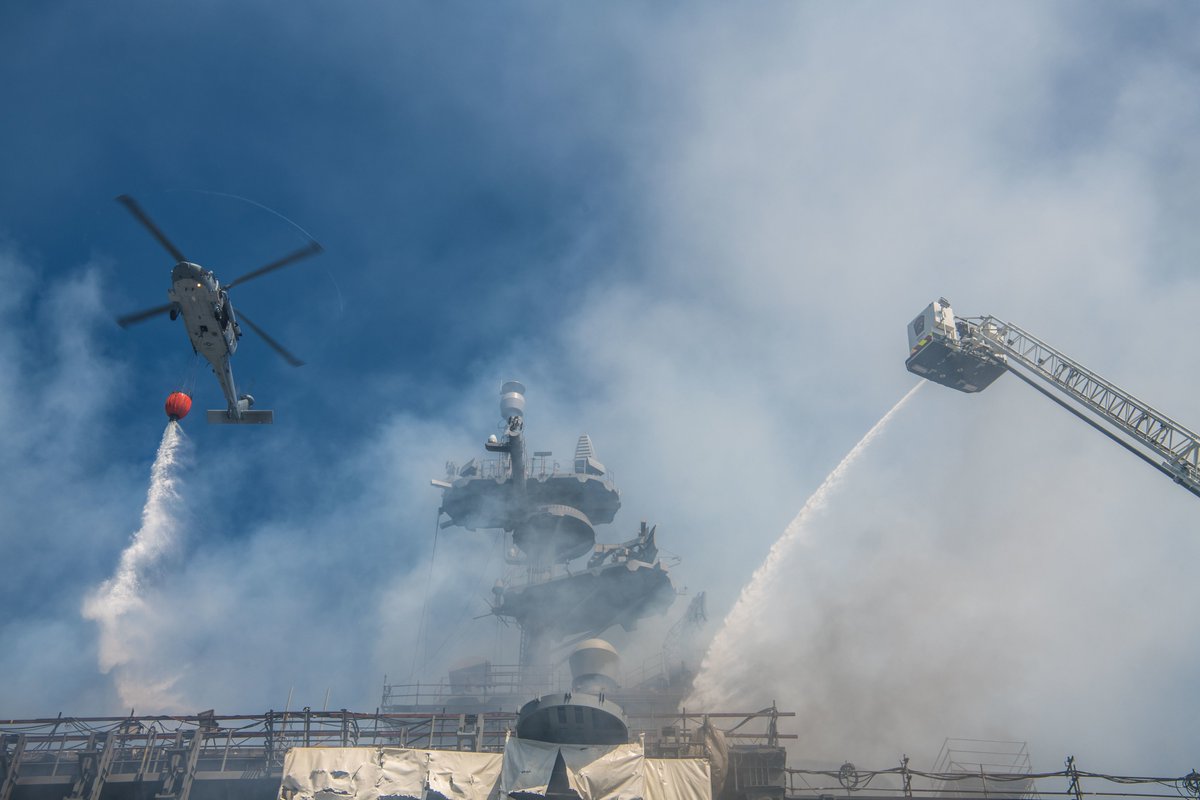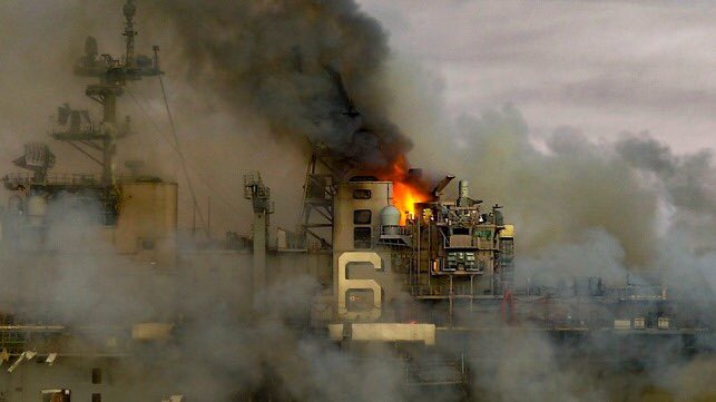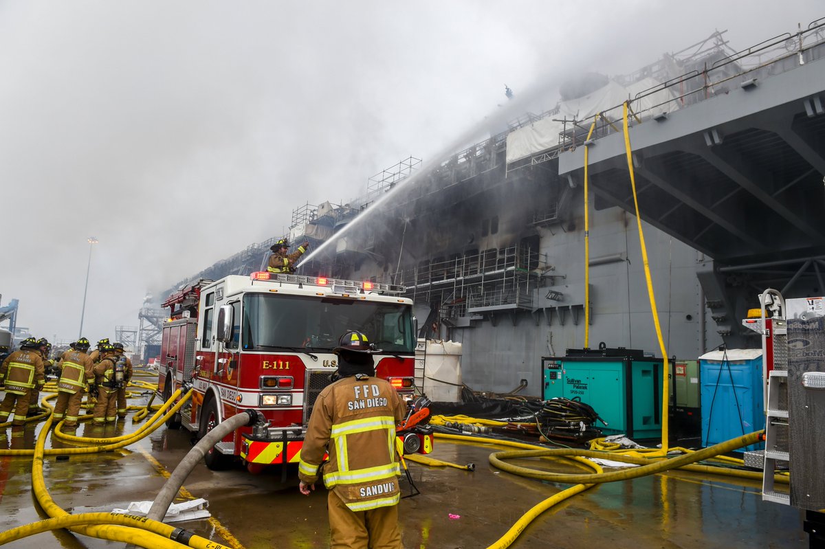 Внутренняя система пожаротушения вышла из строя еще в начале пожара, а предпринимаемые меры пока не дали возможности ликвидировать очаги возгорания. Пожар тушат вертолетами, пожарными командами с пирсами и пожарными судами военно-морской базы Сан-Диего.