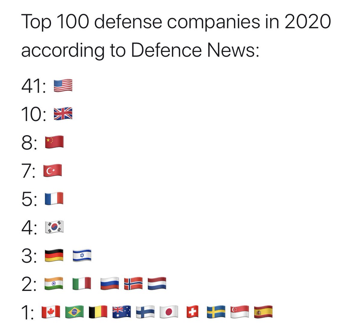 Вышел ежегодный обзор Defence News по крупнейшим оборонным компаниям мира по итогам статистики за 2019-й год.