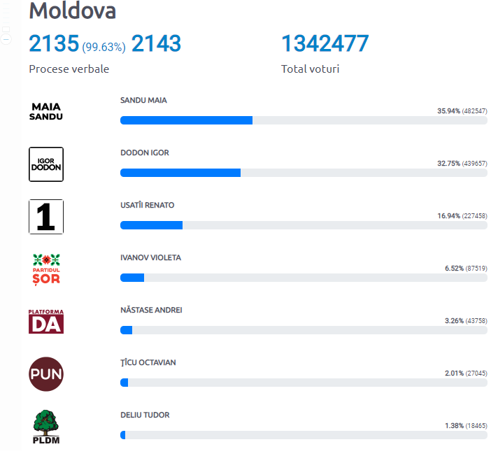 Во второй тур прошли ожидаемо Санду и Додон, но стоит отметить, что Додон прошел со второго места, хотя опросы и экзит-полы показывали, что должен был проходиться с первого.