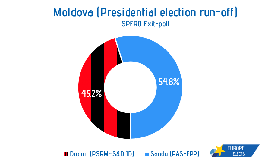Согласно экзит-полам, на выборах президента Молдавии побеждает Санду. Где-то 54-55 на 45-46. Впрочем, разрыв не столь велик, так что подождет официальных цифр.