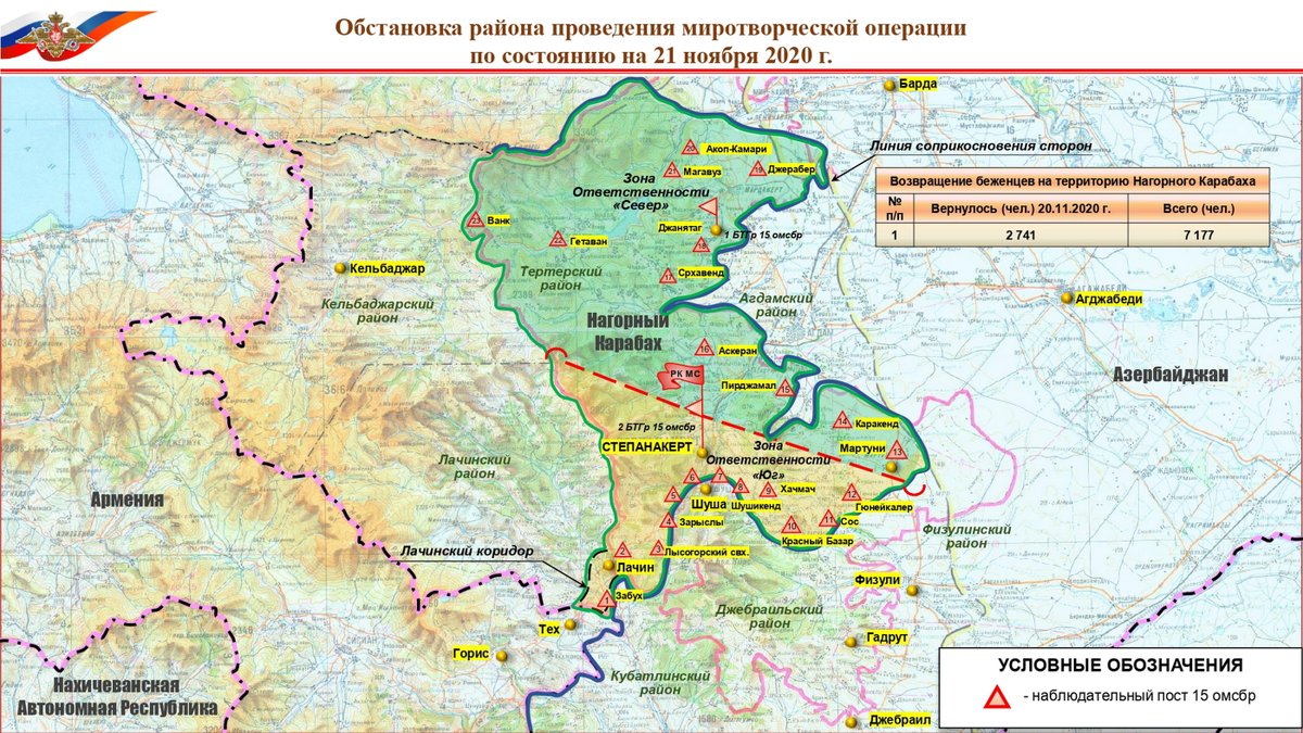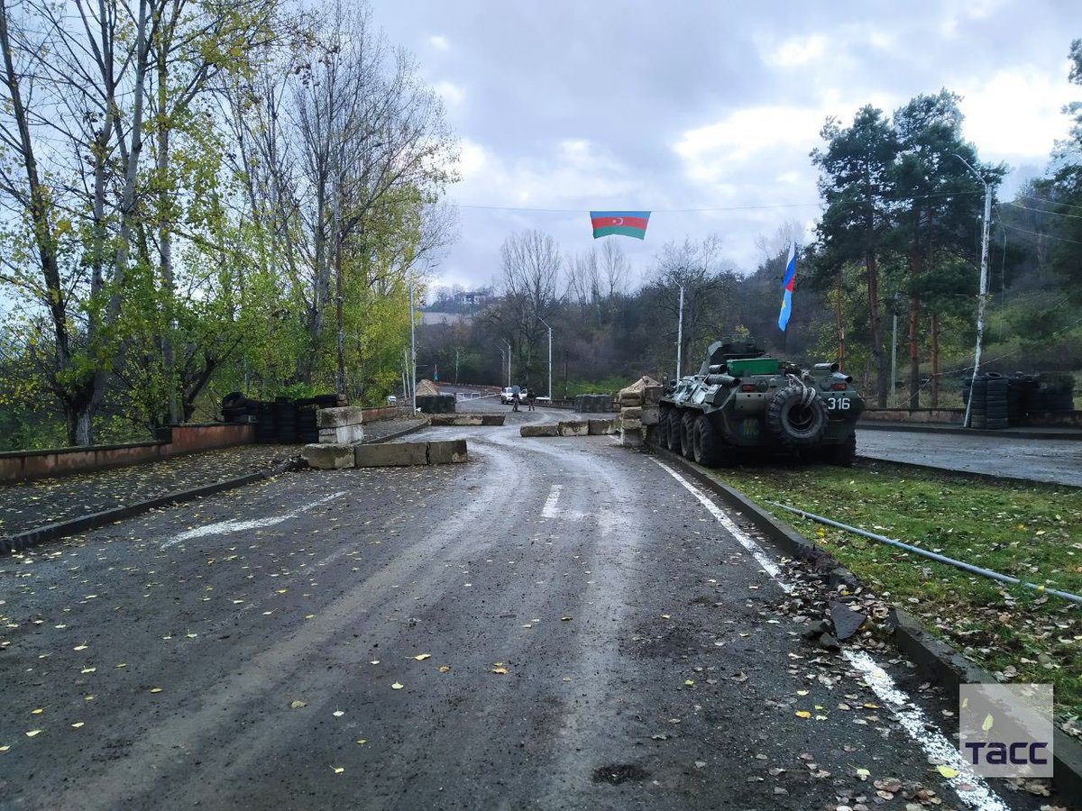 Российские войска также будут размещены в Лачинском коридоре, чтобы гарантировать беспрепятственное наземное сообщение между Арменией и большим Нагорным Карабахом. Лачинский коридор должен быть передан под гражданскую администрацию Азербайджана, в то время как сократившийся в размерах Нагорный Карабах остается азербайджанским де-юре, но де-факто находится вне его юрисдикции. Между тем, Азербайджан поднял свой флаг и устанавливает свою администрацию в возвращенной части Нагорного Карабаха в районе Шуши (Азертаг, 12 ноября).