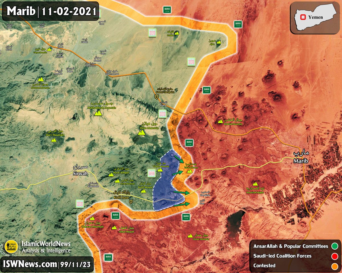 В ходе боев 9-10 февраля хуситы смогли добиться серьезных тактических успехов. Им удалось существенно продвинуться, занять несколько населенных пунктов и ключевых высот. Противник понес серьезные потери и сейчас вынужден на ряде направлений отходить, попутно перебрасывая резервы для купирования наступательной активности хуситов. Командование хадистов заявляет, что ситуация сложная, но находится под контролем. Оно, очевидно, рассчитывает, что сосредоточенные в центральных районах Мариба резервы и поддержка авиации Саудовской Коалиции позволят остановить хуситов на угрожающих направлениях. Фактически хадисты надеются повторить сценарий декабря 2020 года, когда им удалось остановить наступление хуситов на столицу Мариба.