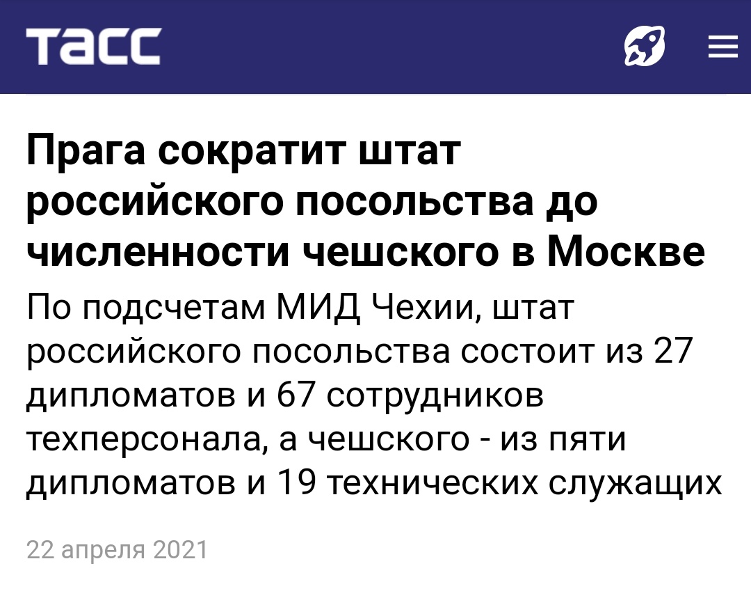1. Чехия обязала Россию до конца мая сократить число своих дипломатов в Праге до аналогичного числа дипломатов в Москве. Также было заявлено, что "это не направлено против народа России".