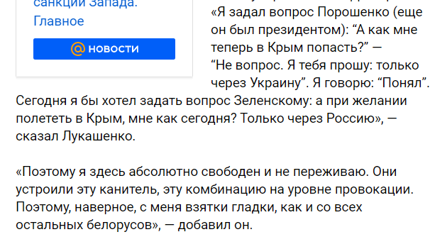 В общем, давление Запада на Лукашенко + идиоты в Киеве, существенно ускоряют решение целого ряда вопросов. По поводу Зеленского можно уже не переживать. Фактически, Зеленский сам подталкивает Лукашенко к признанию Крыма российским де-факто или де-юре.