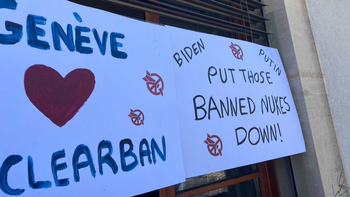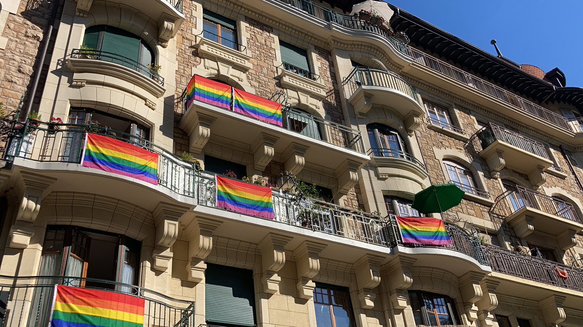 Напротив места переговоров проходит перфоманс швейцарских гомосеков.
