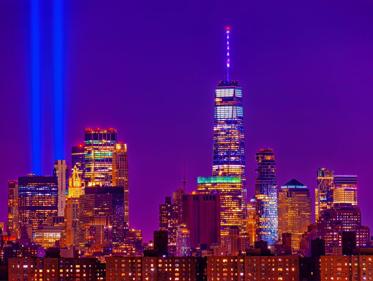 Ночная траурная подсветка на месте, где когда-то стояли башни всемирного торгового центра уничтоженные во время терактов 11 сентября.