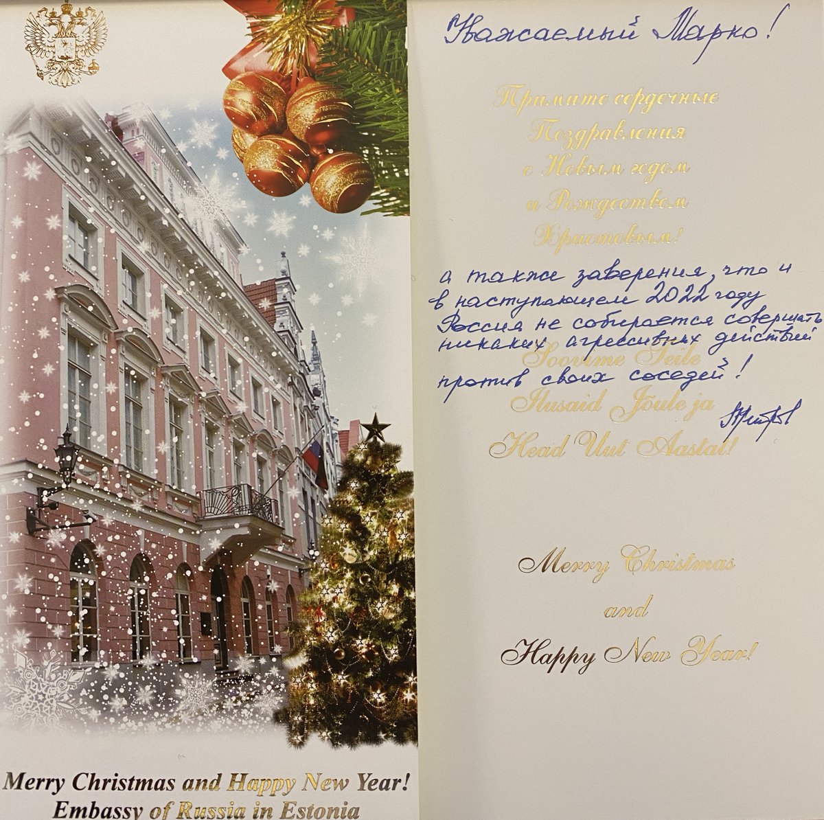 Между тем, похоже, что все мы неправильно понимаем Россию. Я получил рождественскую открытку от посла России в Таллинне (с) Марко Михельсон, председатель Комитета по иностранным делам парламента Эстонии.