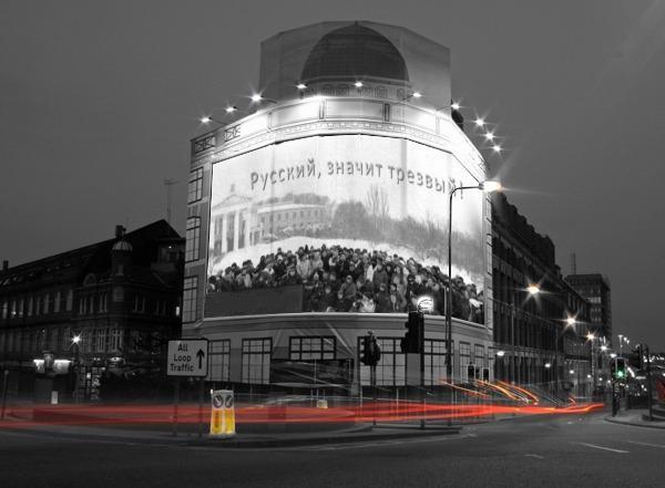 Х*як! — осыпаются стёкла цветочной палатки. Х*як! — дубинами разбита палатка с шаурмой. По краям идут граффити-райтеры и баллоном выводят на стенах и ларьках «Е*ать Кавказ» и ещё что-то.