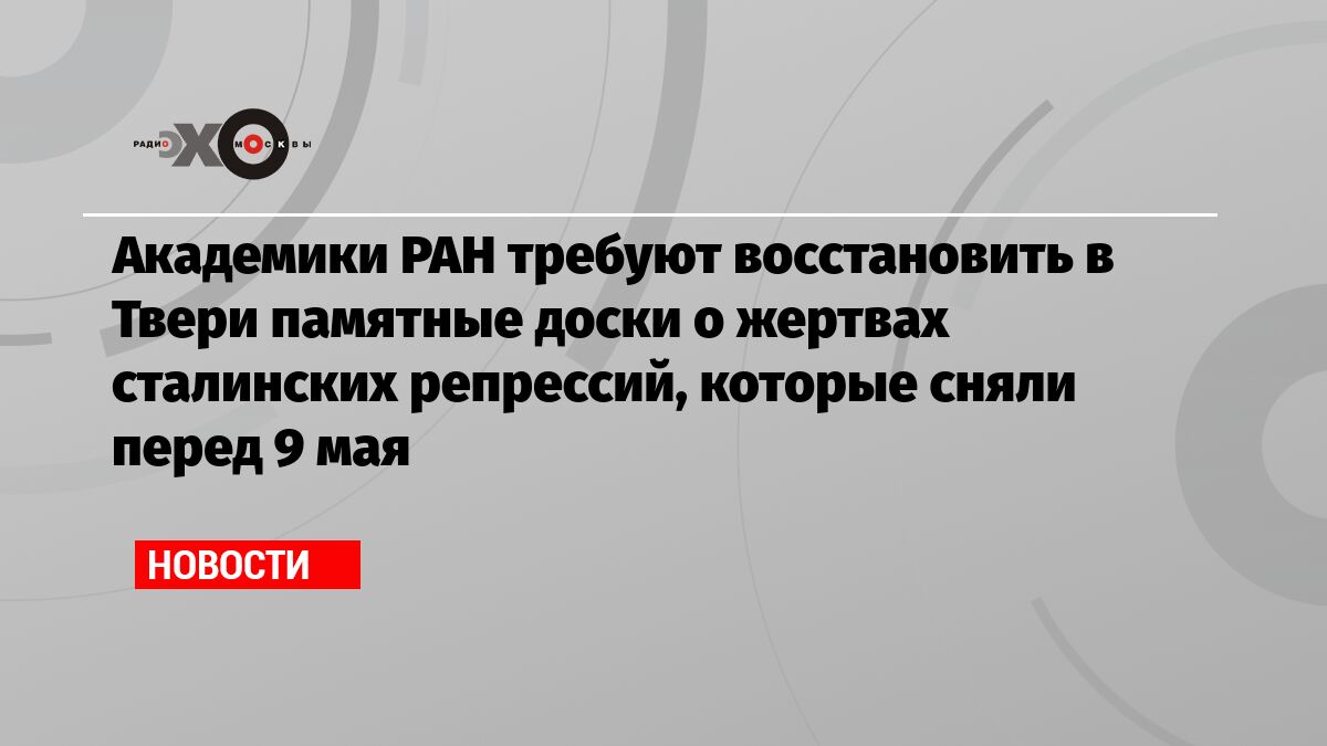 Эхо Москвы</br>Академики РАН требуют восстановить в Твери памятные доски о жертвах сталинских репрессий, которые сняли перед 9 мая</br>Таблички были посвящены пострадавшим и погибшим жителям региона, а также расстрелянным польским военнопленным… / Новости</br> https://tg.i-c-a.su/media/mera_kob/26634
