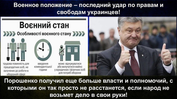 Если раньше еще была надежда, что требования врачей, учителей, или шахтеров все-таки услышат, то с введением военного положения любая попытка заявить о проблемах внутри страны расценивается как сепаратизм и вместе с работой люди могут потерять свободу и даже жизнь. Теперь, пользуясь полученными полномочиями Петр Порошенко отбросил видимость приличий и на любую угрозу своей власти реагирует мгновенно и не церемонясь. А на что может пойти президент Украины чтобы погасить очаг недовольства своим правлением, все уже видели на примере Донбасса.